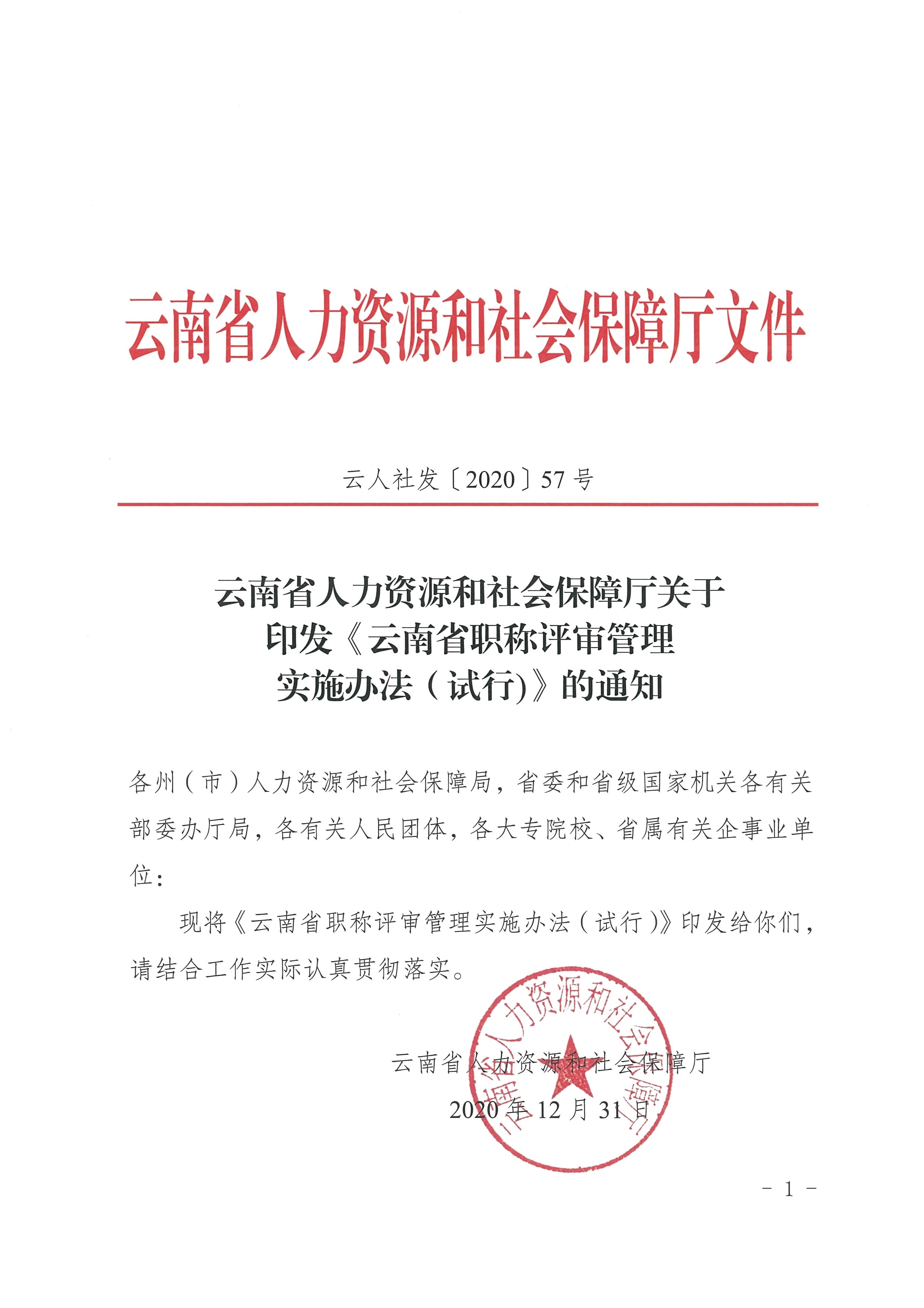 云南省人力資源和社會保障廳關(guān)于印發(fā)《云南省職稱評審管理實(shí)施辦法(試行)》的通知